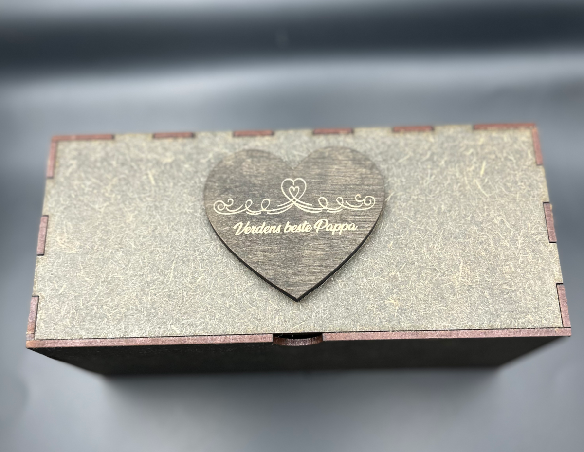 Glassene blir lasergravert med personlig navn, på toppen av lokket er det et hjerte med gravert "Valgfri tekst". boksen er laget i 3mm MDF og kan gjennbrukes til andre formål senere om ønskelig.