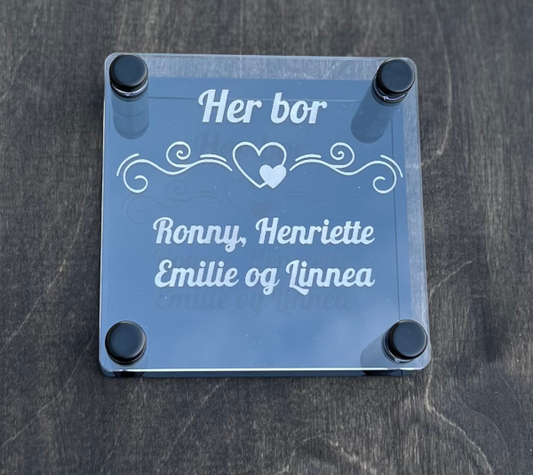 Dørskilt med navn 10x10 eller 14,5x14,5 cm med avstandsstykker delux